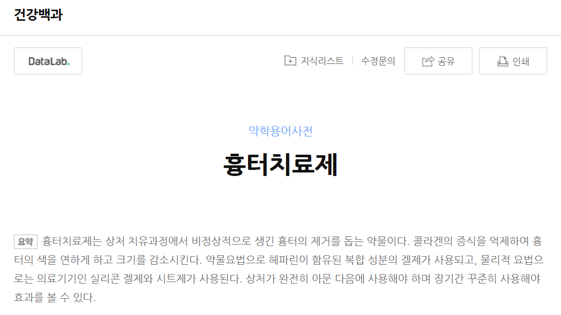 흉터치료제에 대한 약학 용어 사전을 살펴보자. '콜라겐의 증식을 억제하여 흉터의 색을 연하게 하고 크기를 감소시킨다'라고 나와있다.